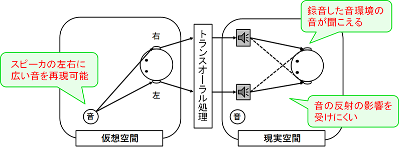 歩行環境シミュレータのためにトランスオーラル再生を用いてリアルな音環境を目指しました。交通事故予防の歩行訓練を行うため、上下運動を伴います。トランスオーラル再生において、頭部の左右移動や頭部の回転には弱い欠点があるという研究報告がありました。そこで、まだ研究していない頭部の上下運動に対するトランスオーラル再生の音像定位性能を調査しました。