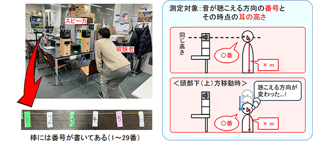 頭部の上下運動に対する音像定位性能の変化を求めるために、被験者の上下運動によって、頭部の上下移動に対するトランスオーラル再生による音像方向を調査する実験を行いました。